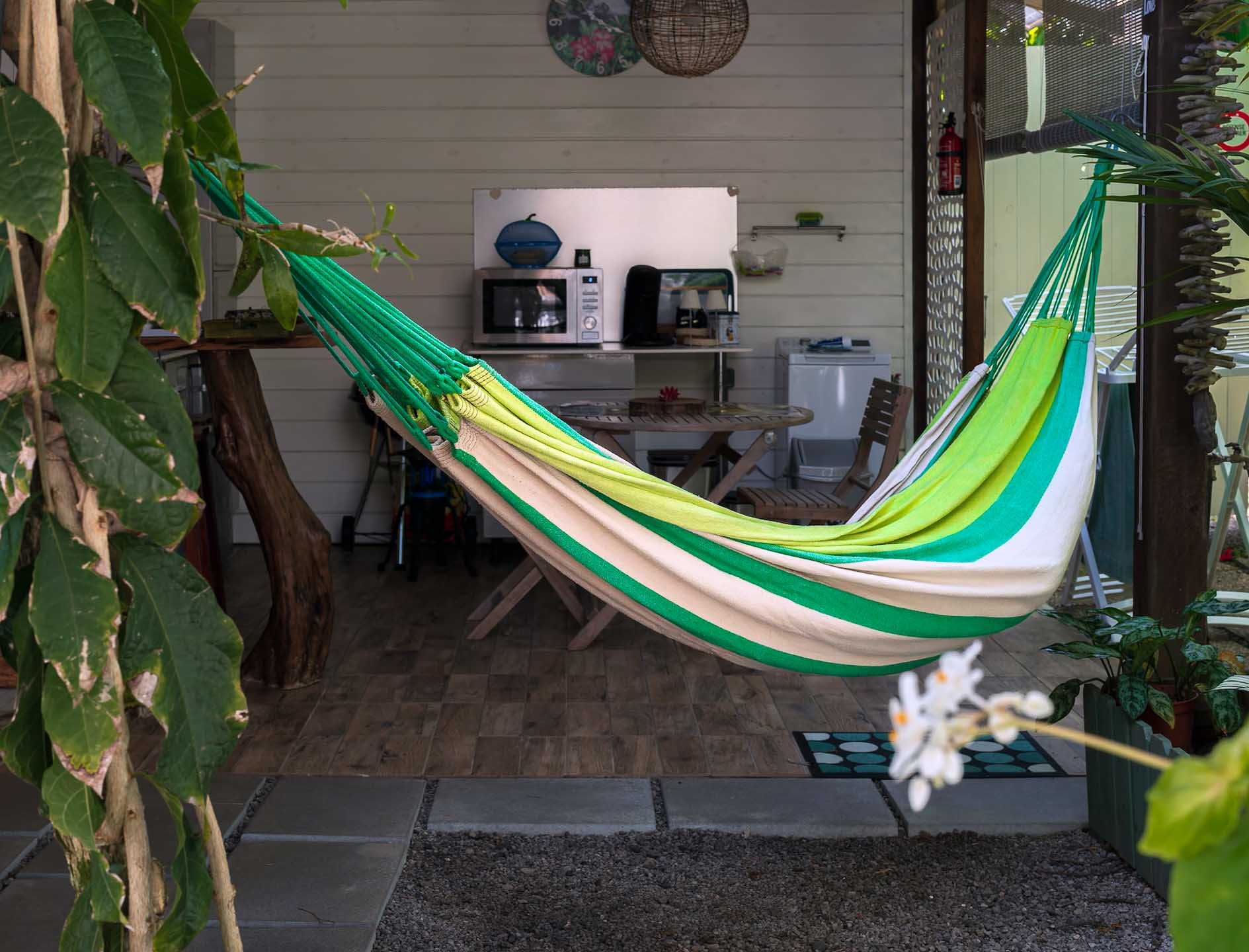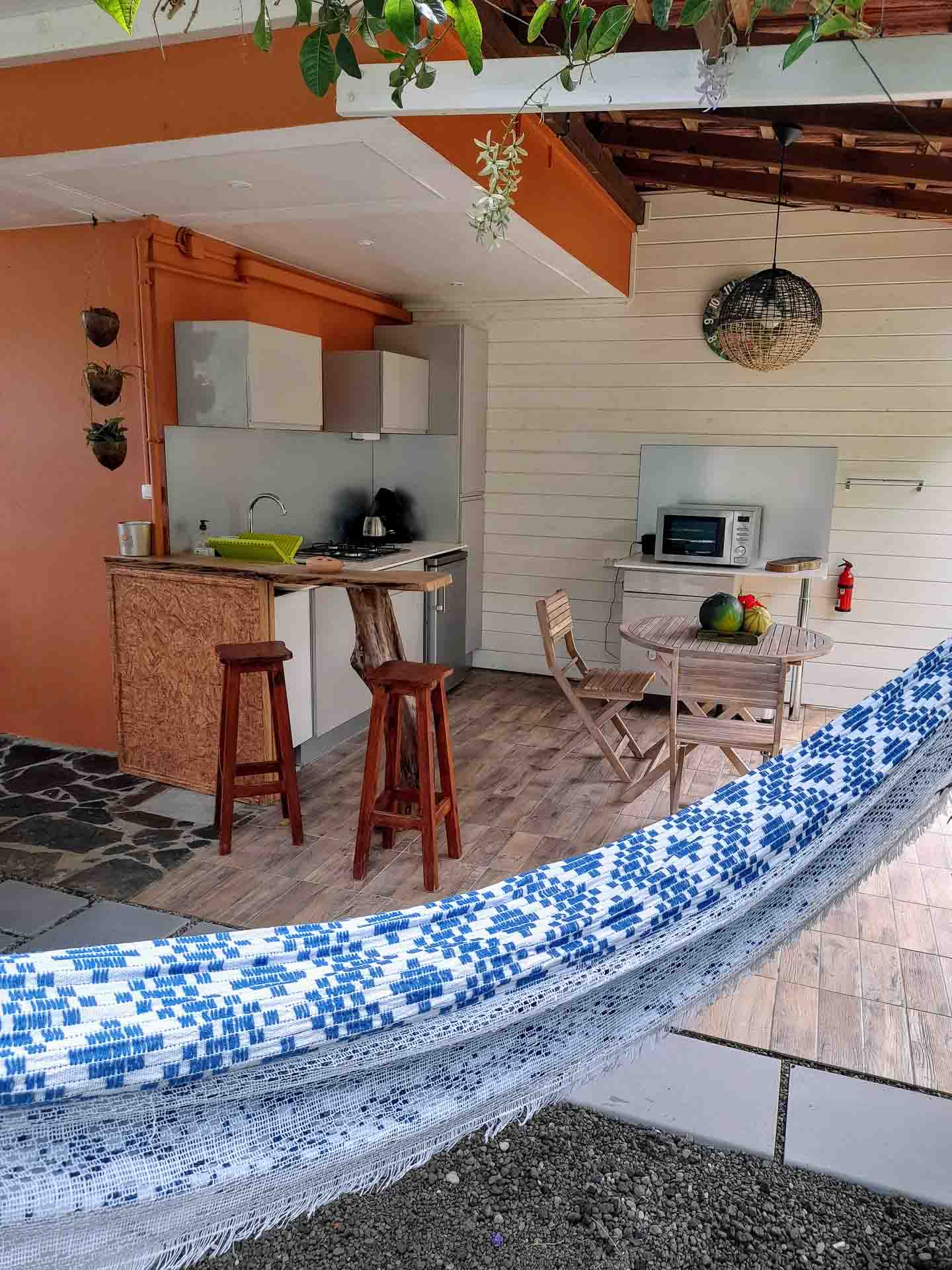 La pièce de vie, ouverte sur l’extérieur, bénéficie d’une ventilation naturelle et d’une luminosité constante. Décoration sobre, mobilier moderne et ambiance sereine pour un séjour reposant en Martinique